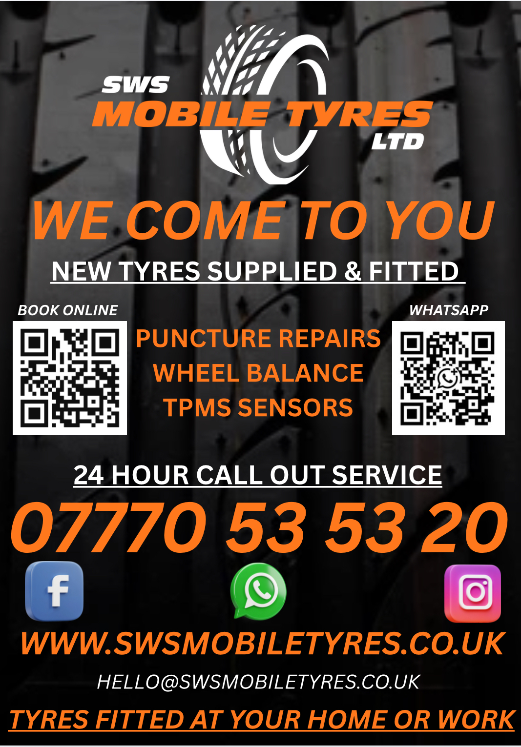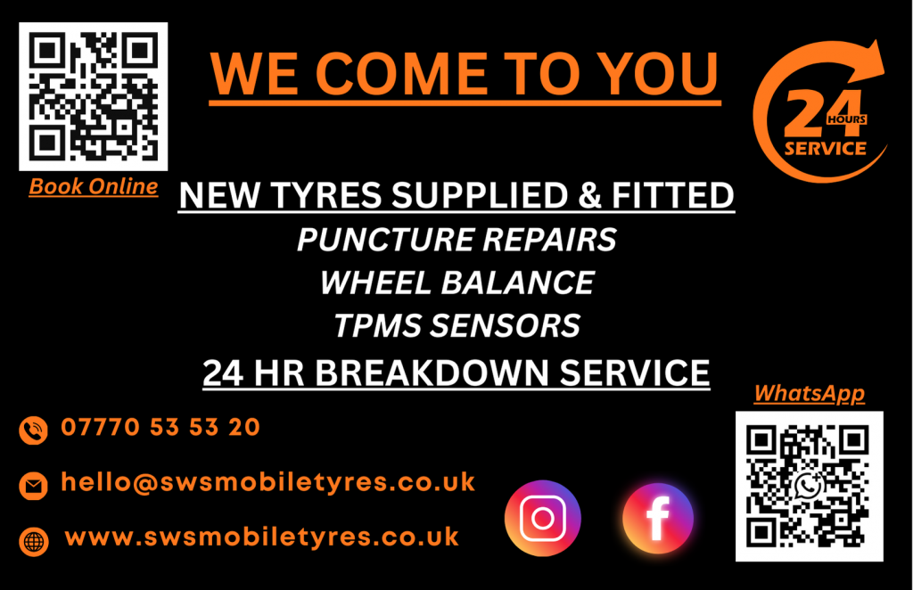 You can reach us by Phone/WhatsApp at 07770535320 or via email at hello@swsmobiletyres.co.uk for swift assistance with your tyre needs.